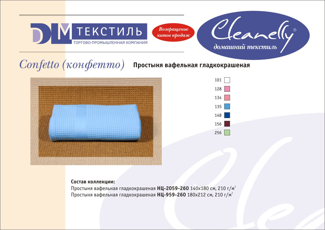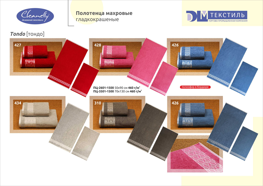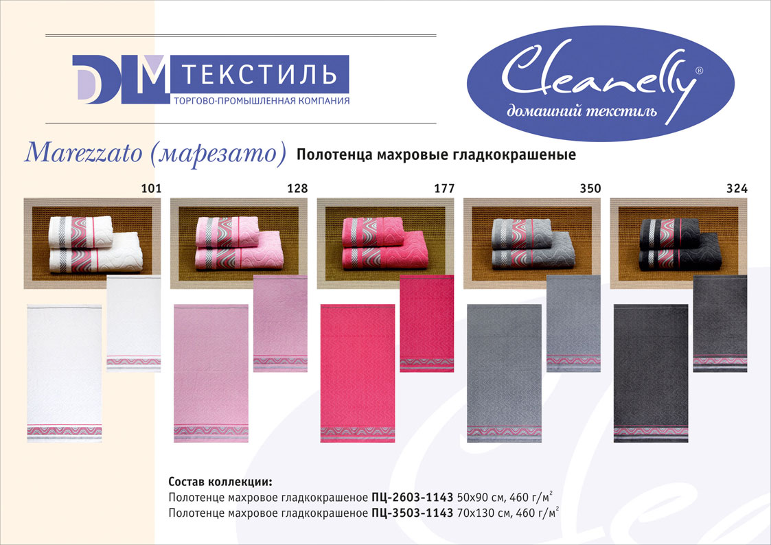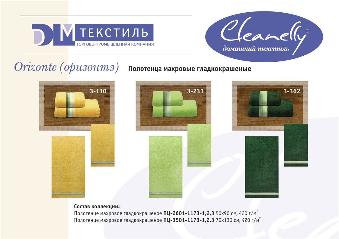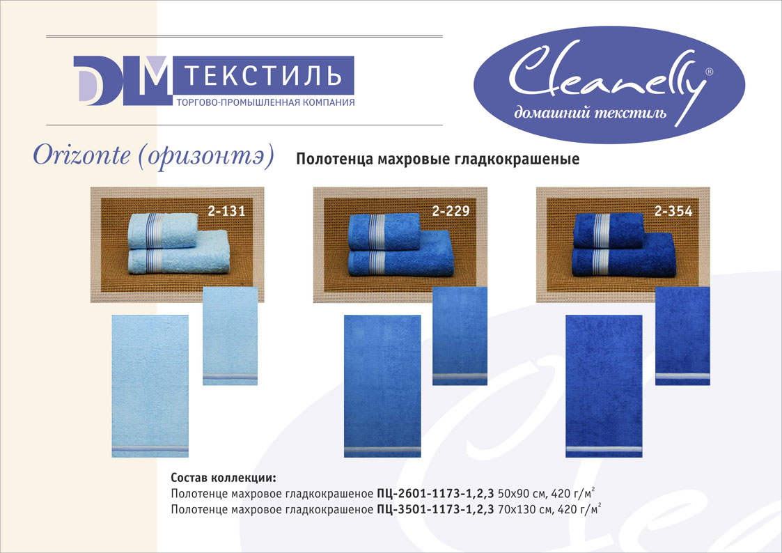 Основной размерный ряд изделий: 30х30, 30х60, 50х50, 50х70, 50х100, 70х140, 100х150, 100х180, 140х180, 180х212. Принцип коллекционности позволяет комплектовать изделия, предназначенные для различных сфер применения (полотенца, халаты, простыни, салфетки) и создавать собственные домашние коллекции.