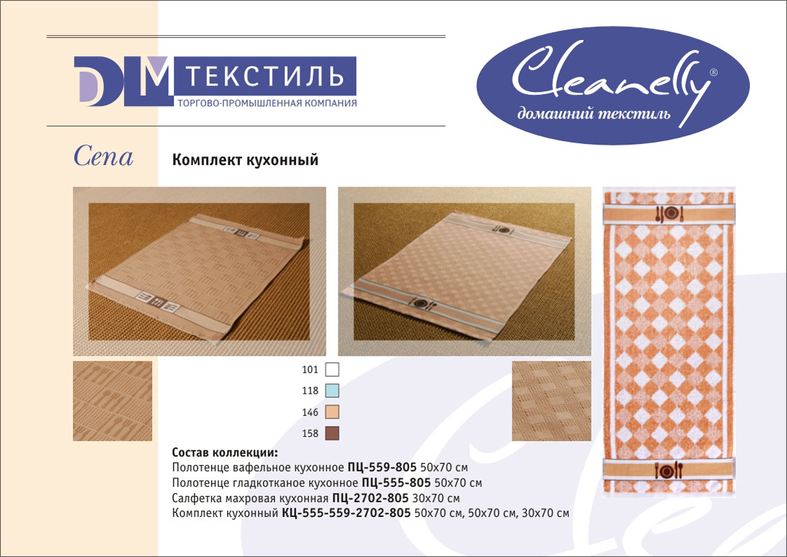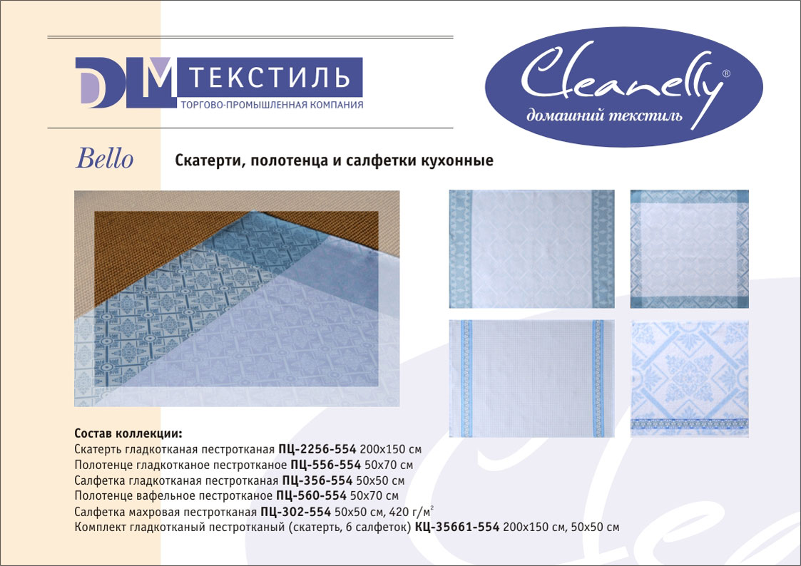 Кухонная группа Cleanelly включает скатерти, полотенца и салфетки из гладкотканого, махрового и вафельного полотна. Стиль столового белья Cleanelly соответствует общей стилистике торговой марки и ориентирован на основные тенденции интерьерной моды.