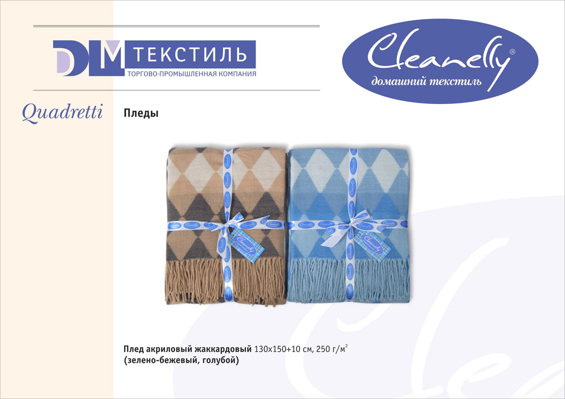 Также под торговой маркой Cleanelly выпускаются коллекции постельных принадлежностей: постельное белье из 100% хлопка, пледы из 100% шерсти или акрила, подушки и одеяла с натуральными и синтетическими наполнителями. Разнообразие материалов и стилевых решений, высокое европейское качество, функциональность и красота – всё это служит залогом полноценного отдыха и хорошего настроения для тех, кто предпочитает практичные и при этом модные вещи Cleanelly.